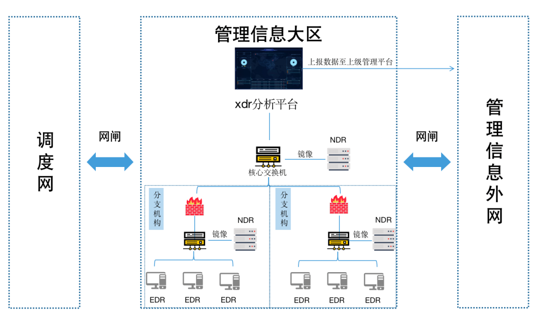 在某省电网调度中,需要对厂站,主站等资产进行终端防护,同时对恶意代码,网络流量等实时监测,统一上报到大数据安全平台,进行多种纬度分析,上报给安管平台,起到辅助决策的作用,业务上耦合,安全上统一。