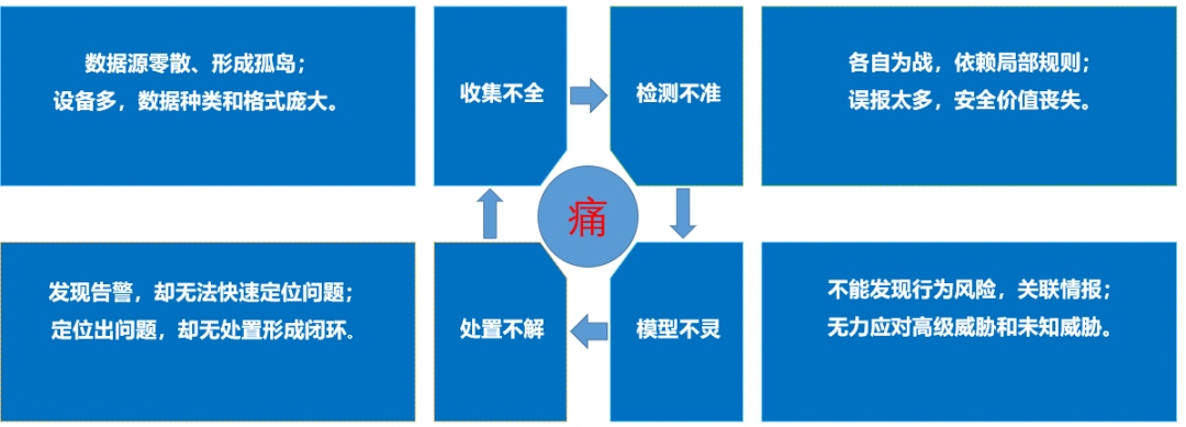终端安全由于本地安装的局限性,无法全局把控网内的高级威胁和病毒的动态行为,使其有漏报风险;边界安全由于在旁路监测大量数据与协议,缺乏高效算力和精准情报,使其误报过多,常常需要人工二次排查过滤;只有通过大数据分析平台将终端安全和边界安全有效融合,才能够全方位立体发现网络攻击,阻断攻击链,减少攻击面,同时还可以解决客户现有产品的难隐之痛: